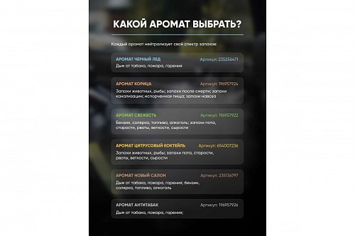 Нейтрализует неприятные запахи (гари, животных, табака, испорченных продуктов, сырости, масел) в воздухе, на тканевых, текстильных и твердых поверхностях.