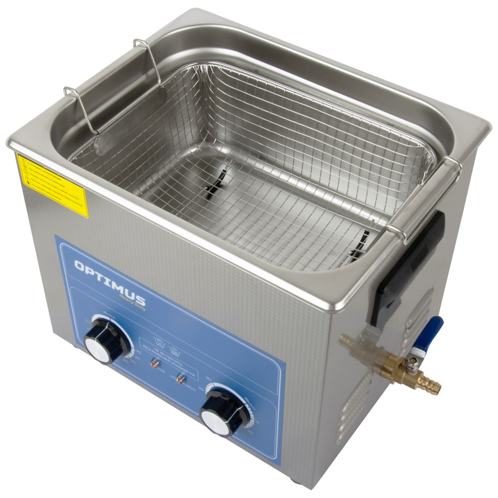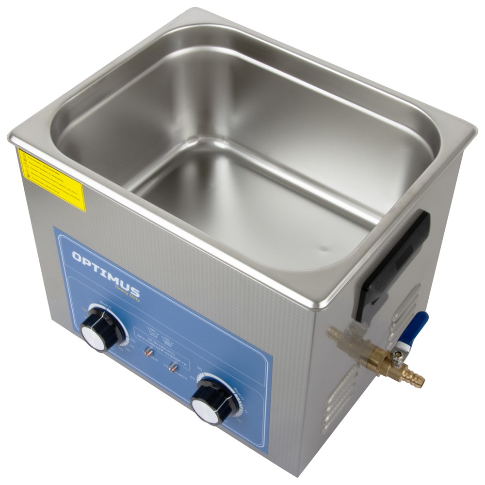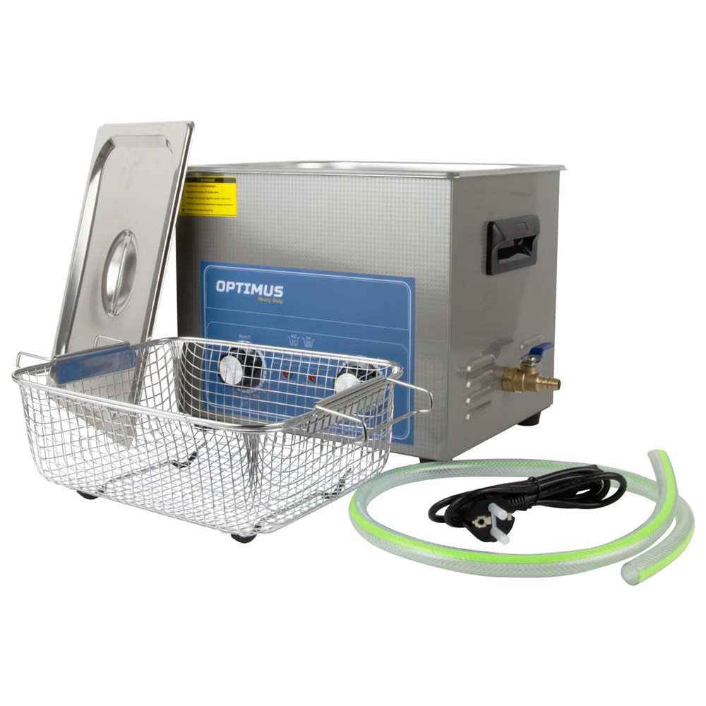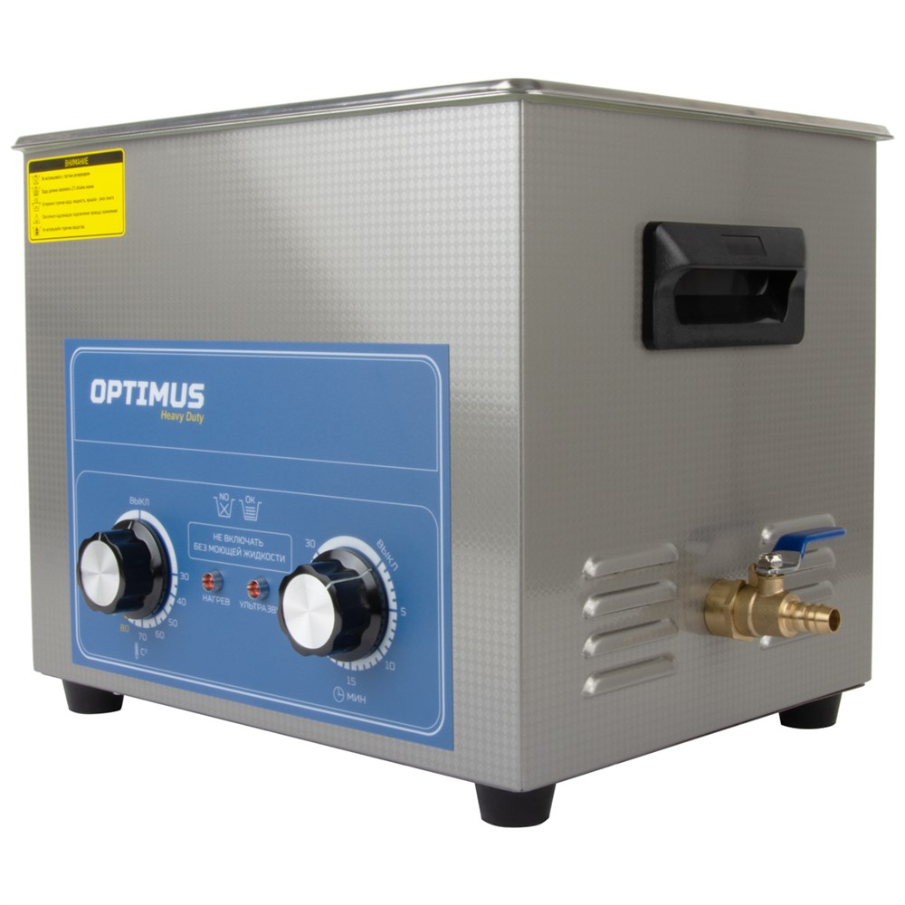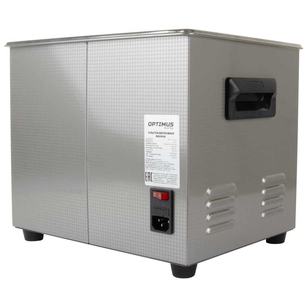 Ультразвуковая ванна OPTIMUS OPT-UC100 для очистки различных деталей, узлов и механизмов от загрязнений путем воздействия высокочастотных ультразвуковых колебаний в моющем растворе. Мойка оснащена механическим таймером до 30 минут и подогревом до 80 °C. Подогрев способствует ускорению физических процессов, сокращается время очистки предметов. Мойка укомплектована корзиной, ножки которой имеют резиновое покрытие, защищающее поверхность бака от механических повреждений. Спусковой кран, к которому в комплекте предусмотрен шланг, упрощают процесс слива раствора из устройства. Корпус выполнен из качественной нержавеющей стали, что способствует увеличению срока эксплуатации. Мощность ультразвука 240 Вт, мощность нагрева 200 Вт.