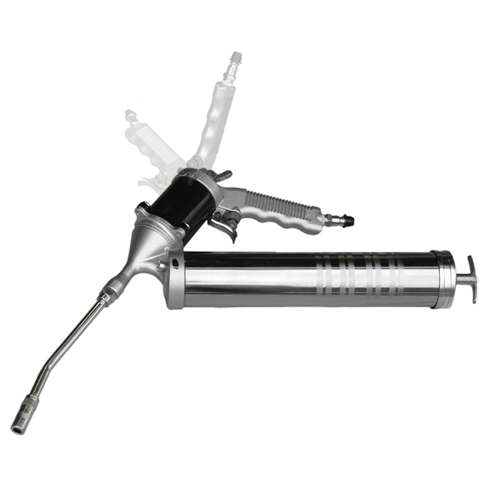 Пневматический шприц для консистентных смазок, с поворотной головкой для удобства работы. Дополнительно оснащен механизмом поворота рукоятки для работы в ограниченном пространстве.