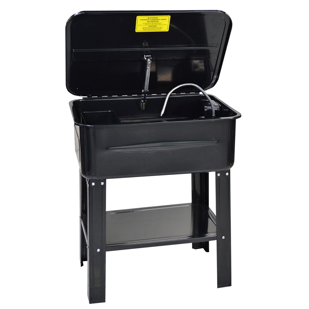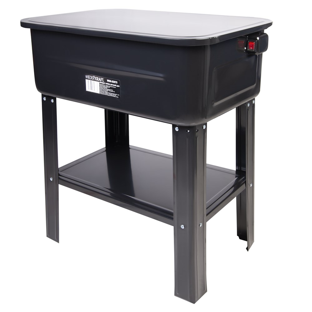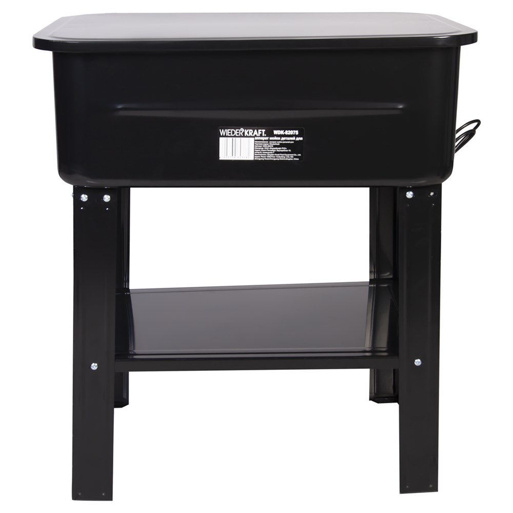 Промывочная ванна WDK-82075 оснащена электрическим насосом для подачи очищающего раствора и резервуаром большой ёмкости. Отличается повышенной мощностью напора жидкости для очистки. Позволяет загружать одновременно большое количество деталей. Размещается на разборном стенде с ножками и полкой (в комплекте).