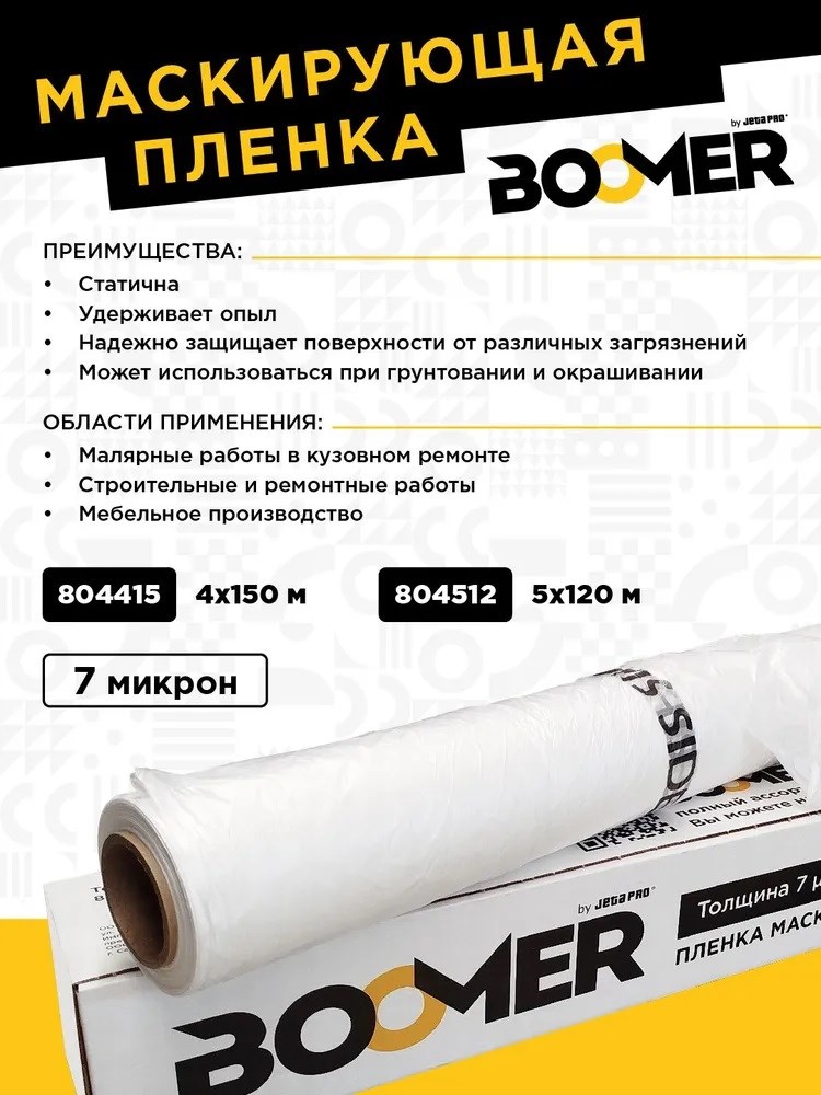 Маскировочная плёнка статичная Boomer 7 мкм предназначена для защиты различных поверхностей и предметов от пыли, краски, влаги и других загрязнений при проведении малярно-кузовных, строительных и ремонтных работ.