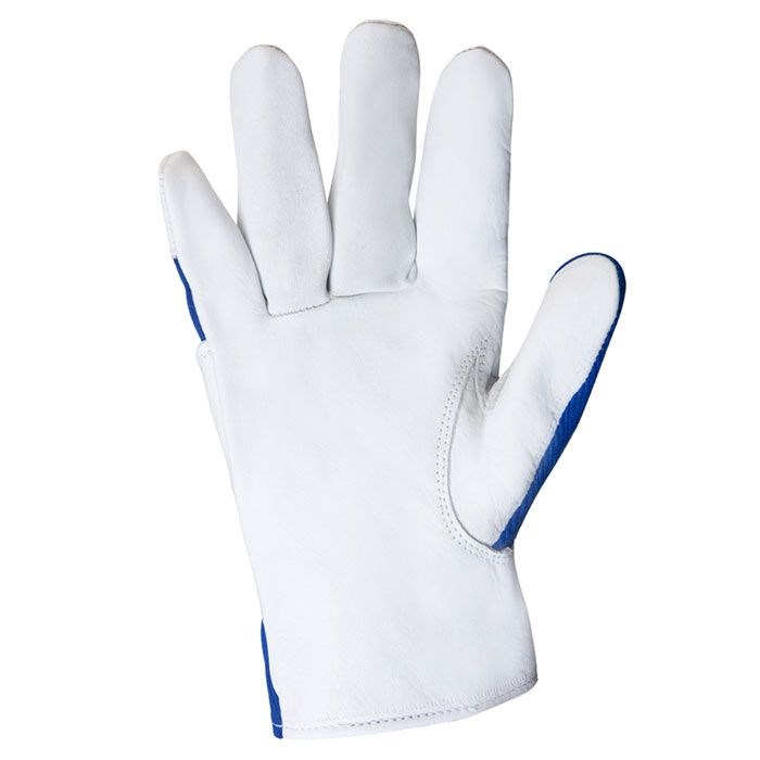 Описание Кожаные рабочие перчатки Locksmith с тыльной стороной из хлопка, цвет синий/белый. Материал: тыльная сторона: хлопок; ладонь: коровья кожа качество A.