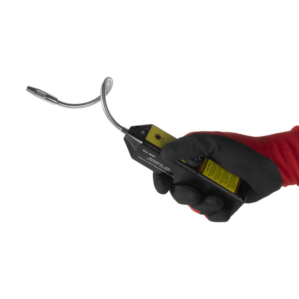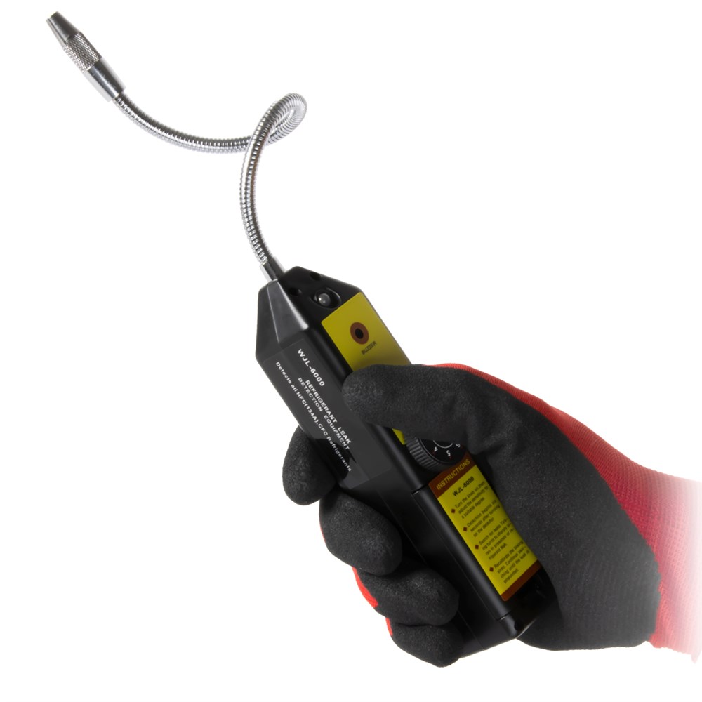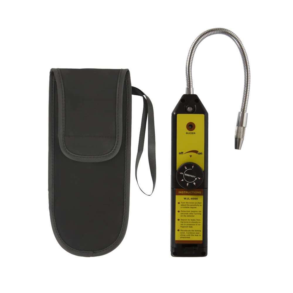 Детектор утечки хладагента WiederKraft WJL-6000 оснащен ионным сенсором. Используется для поиска утечек ГФУ, ГХФУ, ХФУ и СН хладагентов и других веществ с содержанием хлора, фтора или брома. При обнаружении утечки частота мерцания светодиода и звукового сигнала увеличивается. Прибор предназначен для работы при температуре от 0°С до +52°С.
